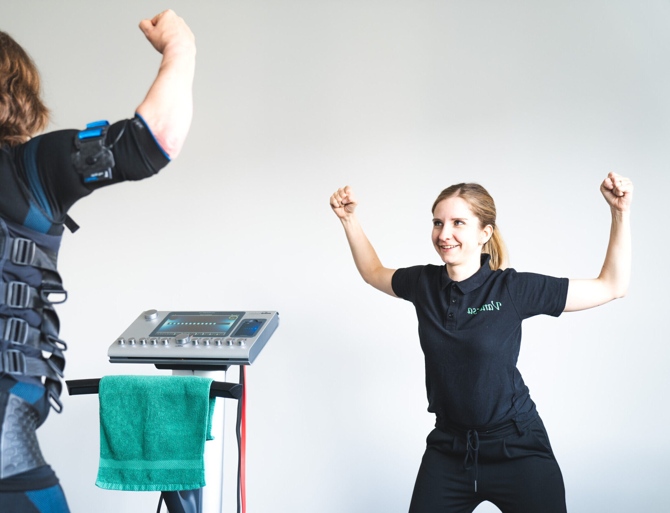 Beim EMS-Training stehe ich die ganze Zeit an deiner Seite. Ich achte auf die richtige Ausführung, passe die Impulse individuell an und motiviere dich während der gesamten Einheit. So trainierst du effektiv und sicher.